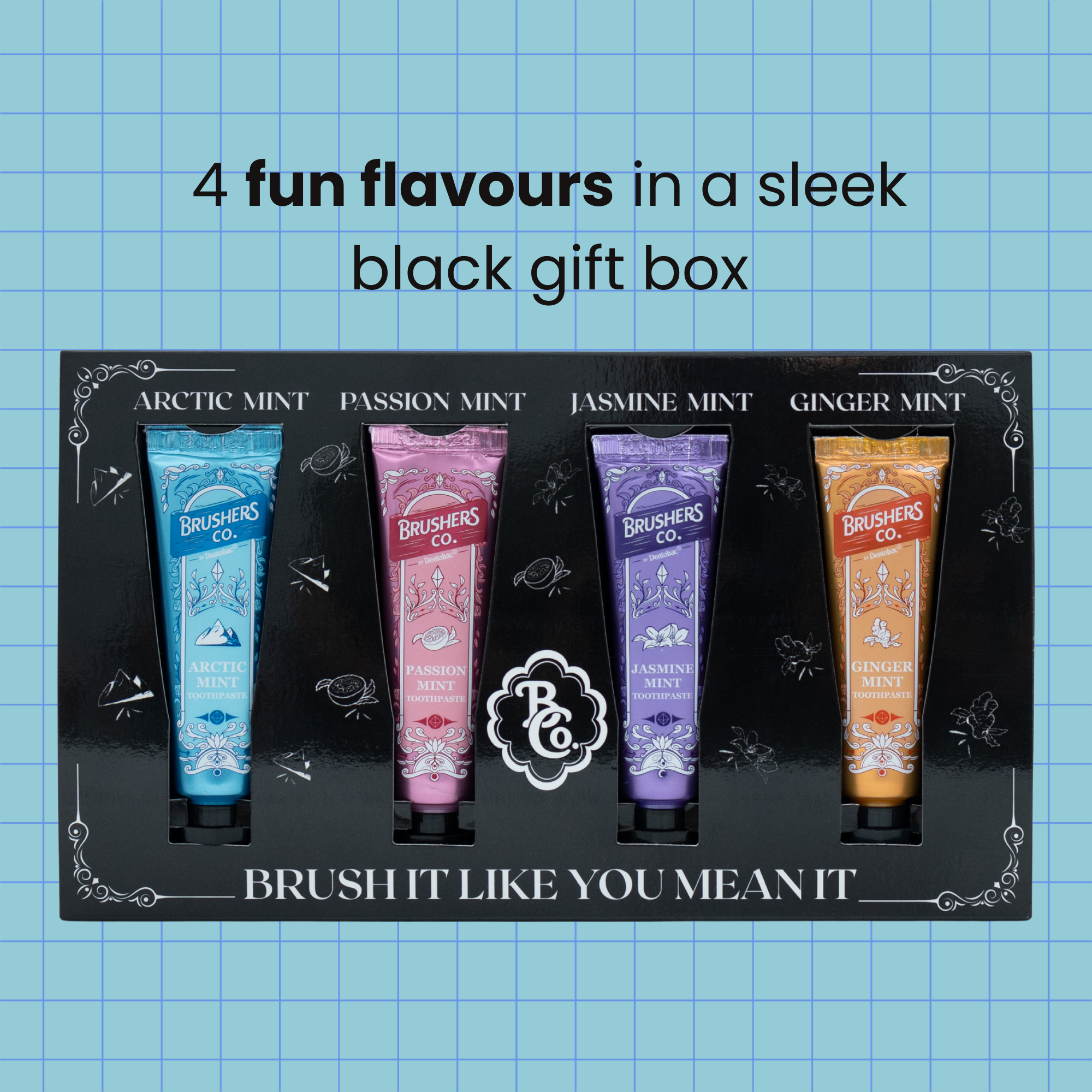 A trial pack featuring all four Brushers Co flavours in mini sizes.